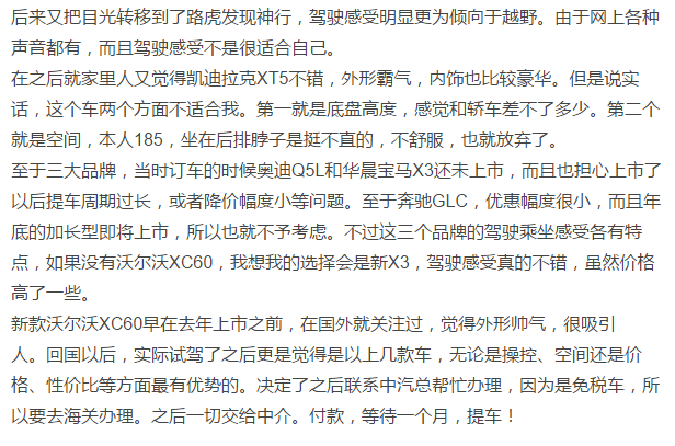至于品牌當(dāng)時訂車時候奧迪Q5L華晨寶馬X3還未市而且也擔(dān)心市以后提車周期過或者降價幅度等問題至于奔馳GLC優(yōu)惠幅度而且年底加型即將市所以也就予考慮過這個品牌駕駛乘坐感受各有特點如果沒有沃爾沃XC60我想我選擇會新X3駕駛感受真錯雖然價格些