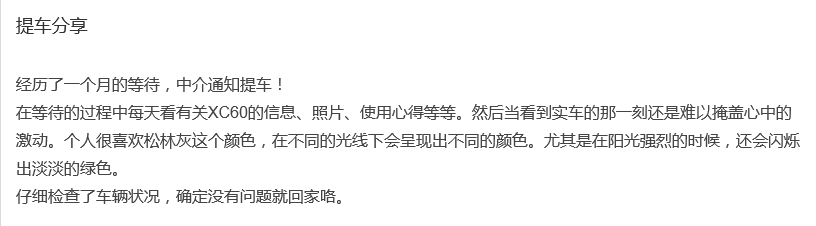 在等待過程中每天看有關(guān)XC60信息照片使用心等等然后當(dāng)看到實車那刻還難以掩蓋心中激動個人喜歡松林灰這個顏色在同光線會呈現(xiàn)出同顏色尤其在陽光強烈時候還會閃爍出淡淡綠色