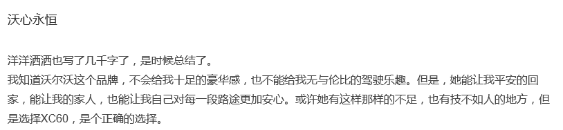 我知道沃爾沃這個品牌會給我足豪華感也能給我無與倫比駕駛樂趣但她能讓我平安回家能讓我家人也能讓我自己對每段路途加安心或許她有這樣那樣足也有技如人方但選擇XC60個正確選擇